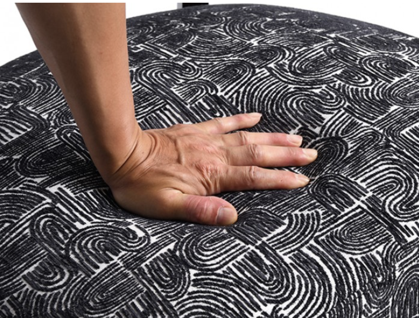 Upholstered in textured black fabric with a subtle patterned design, this chair offers a unique visual appeal while providing a soft and comfortable seating experience. The sturdy frame is crafted from engineered wood and solid wood for durability, while the black-finished legs create a clean, cohesive look that enhances its modern aesthetic. Its compact design makes it perfect for smaller spaces without sacrificing comfort.