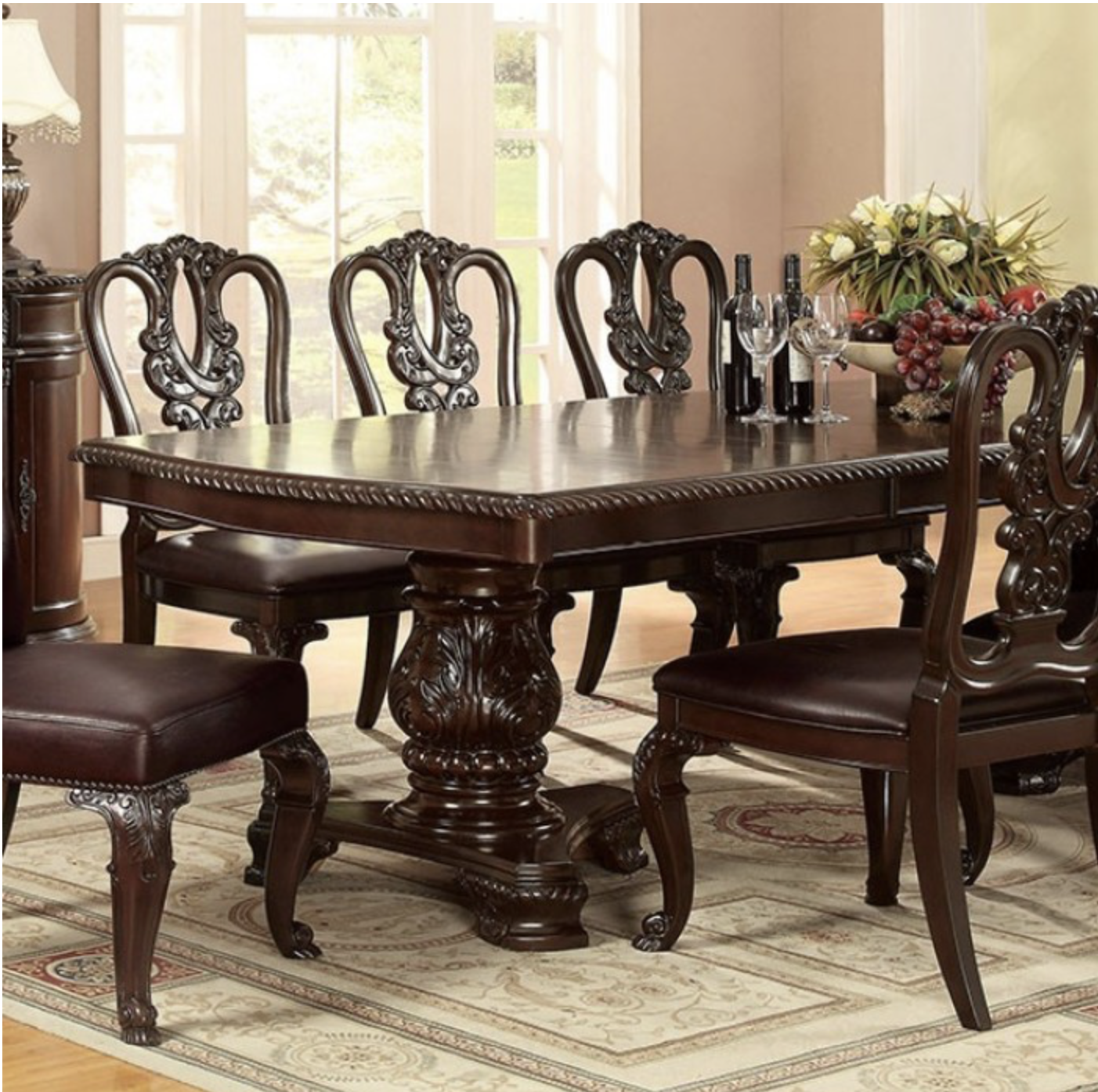 Finished in a deep brown cherry tone, the table features a beautifully detailed double pedestal base with intricate carvings that add depth and sophistication. The spacious tabletop includes expandable leaves, allowing you to easily accommodate larger groups when entertaining.