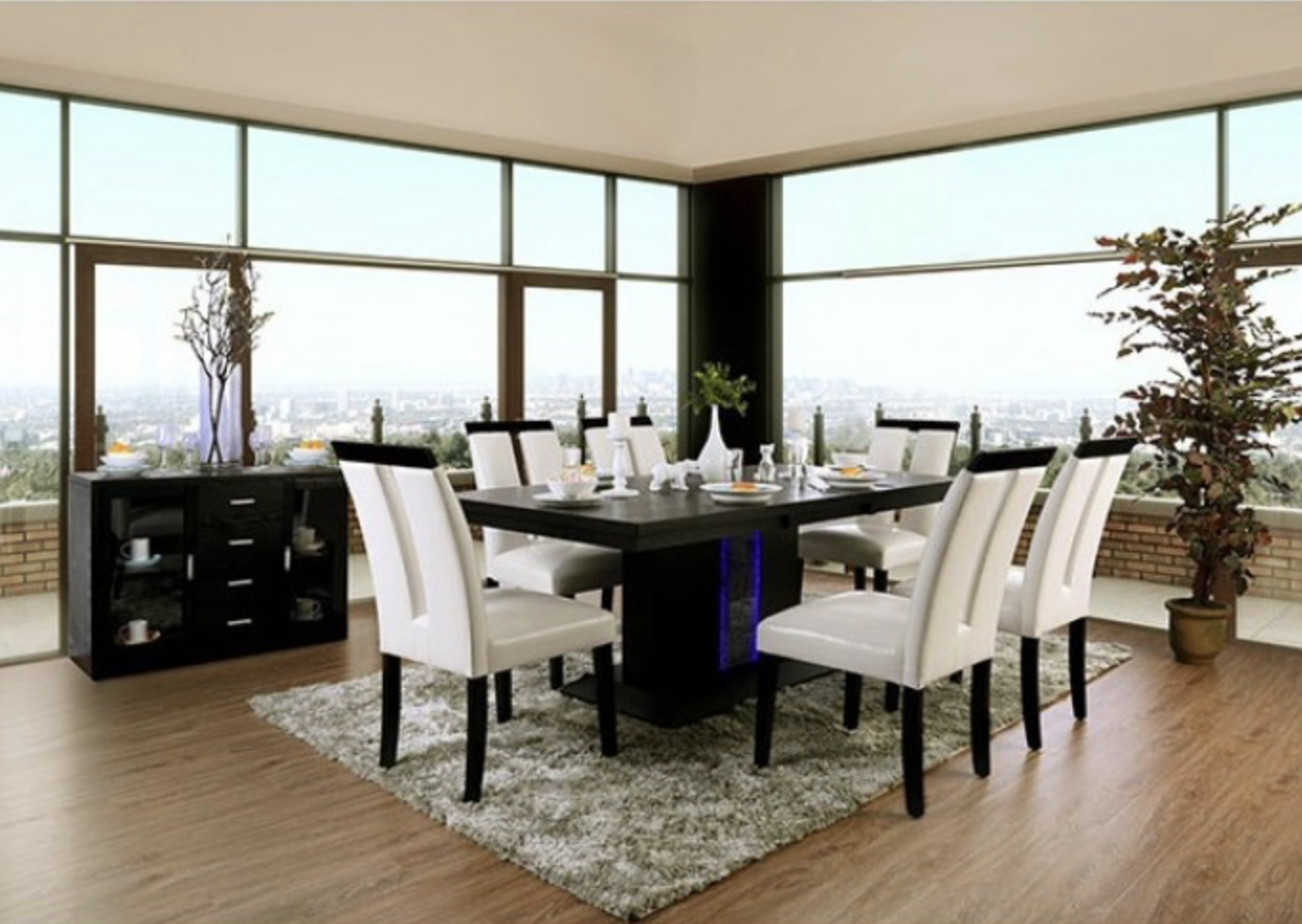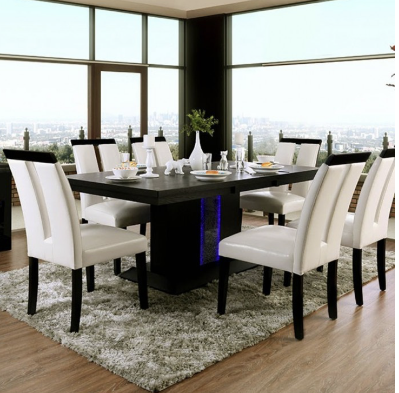 Bring bold, modern style to your dining space with the Evangeline 7-piece dining table set. Designed with sleek lines and a striking contemporary aesthetic, this set makes a statement while offering everyday functionality.