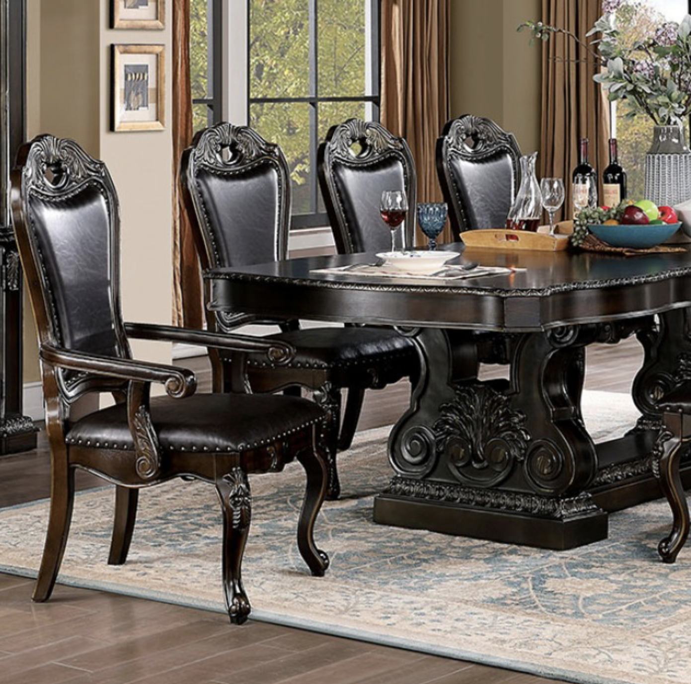The matching chairs showcase graceful curves, detailed woodwork, and plush leatherette seating, offering both comfort and sophistication. Nailhead trim accents complete the design, adding a touch of classic luxury to every seat.