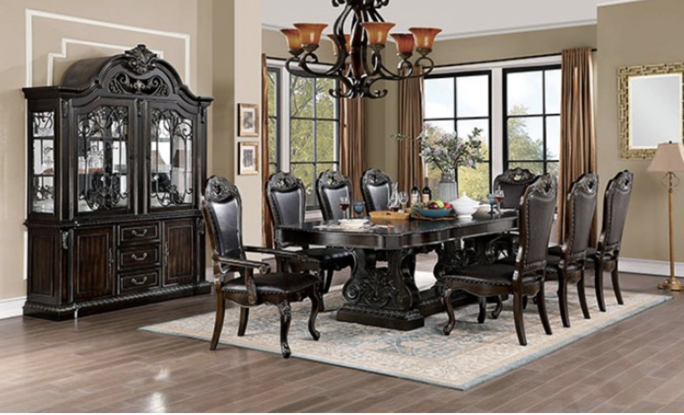 Bring bold elegance and timeless craftsmanship to your dining space with the Lombardy 9-piece dining table set. Designed to make a statement, this collection blends classic traditional styling with luxurious details for a refined, upscale look.