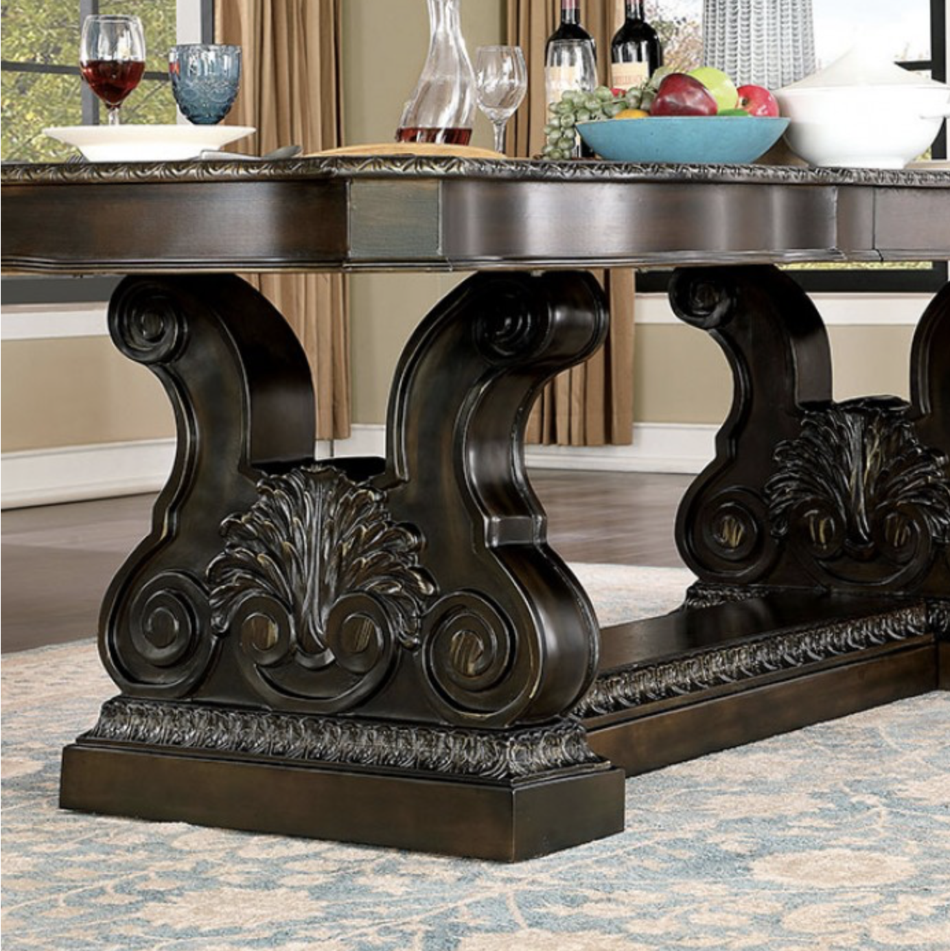 Finished in a rich walnut tone, the table features an intricately carved trestle base that adds depth and character. The expansive tabletop includes two 15-inch leaves, allowing you to easily extend the table for larger gatherings and special occasions.