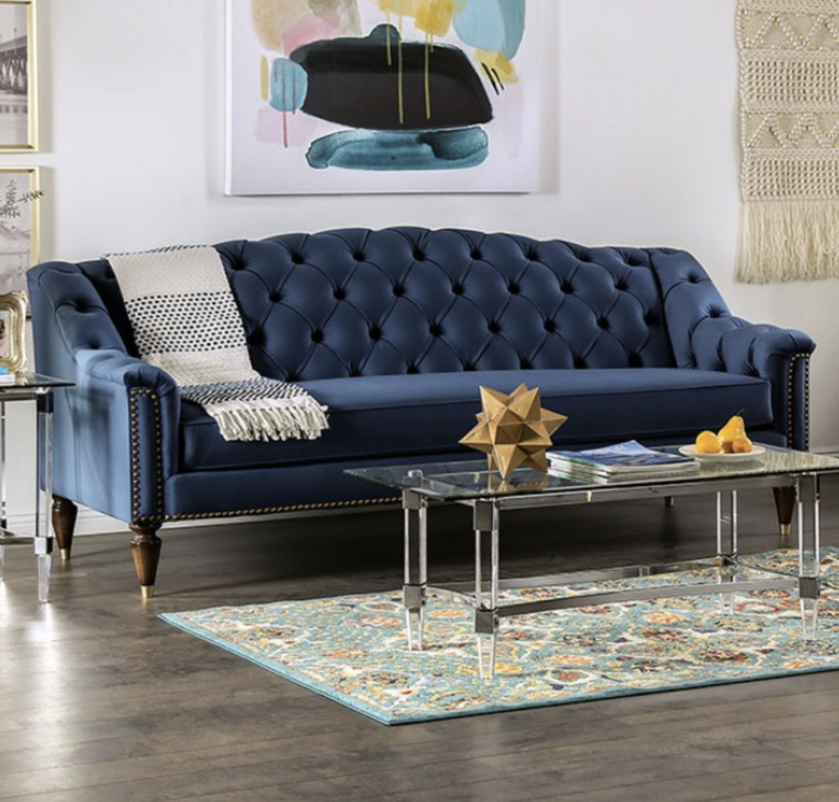 Bring refined elegance and luxurious comfort to your living space with this beautifully designed transitional sofa and loveseat set. Featuring a timeless silhouette and rich blue upholstery, this set blends classic style with modern sophistication, making it an elegant centerpiece for both traditional and contemporary interiors.