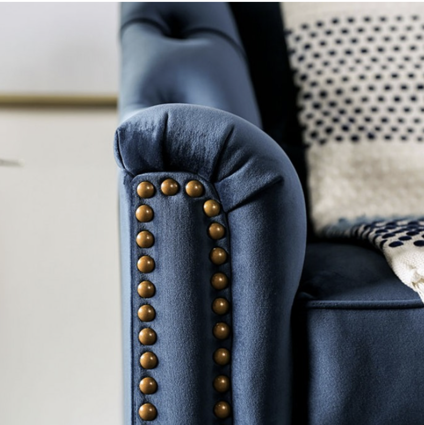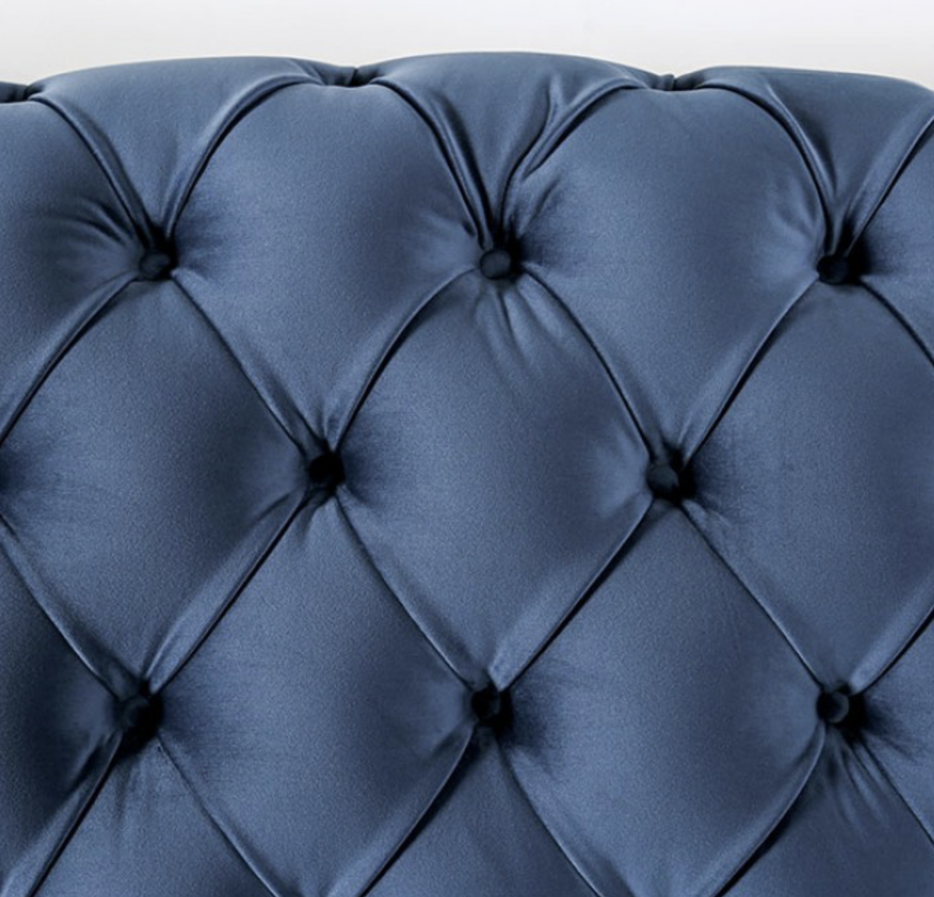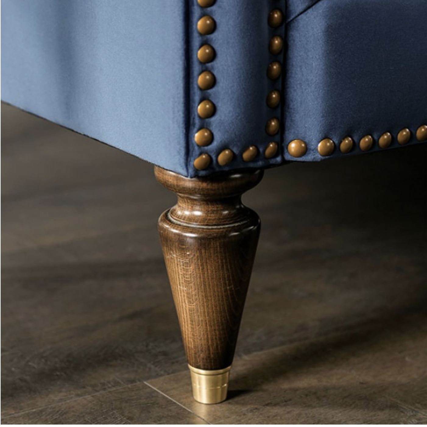 Upholstered in rich blue velvet-like fabric, the sofa offers a soft, plush feel while maintaining a refined appearance. The deep tufted backrest and gracefully curved arms create a timeless look, while the generously padded seat cushions provide exceptional comfort for relaxing or entertaining. A durable solid wood frame ensures long-lasting support, and the warm walnut-finished legs add contrast and stability to the design.