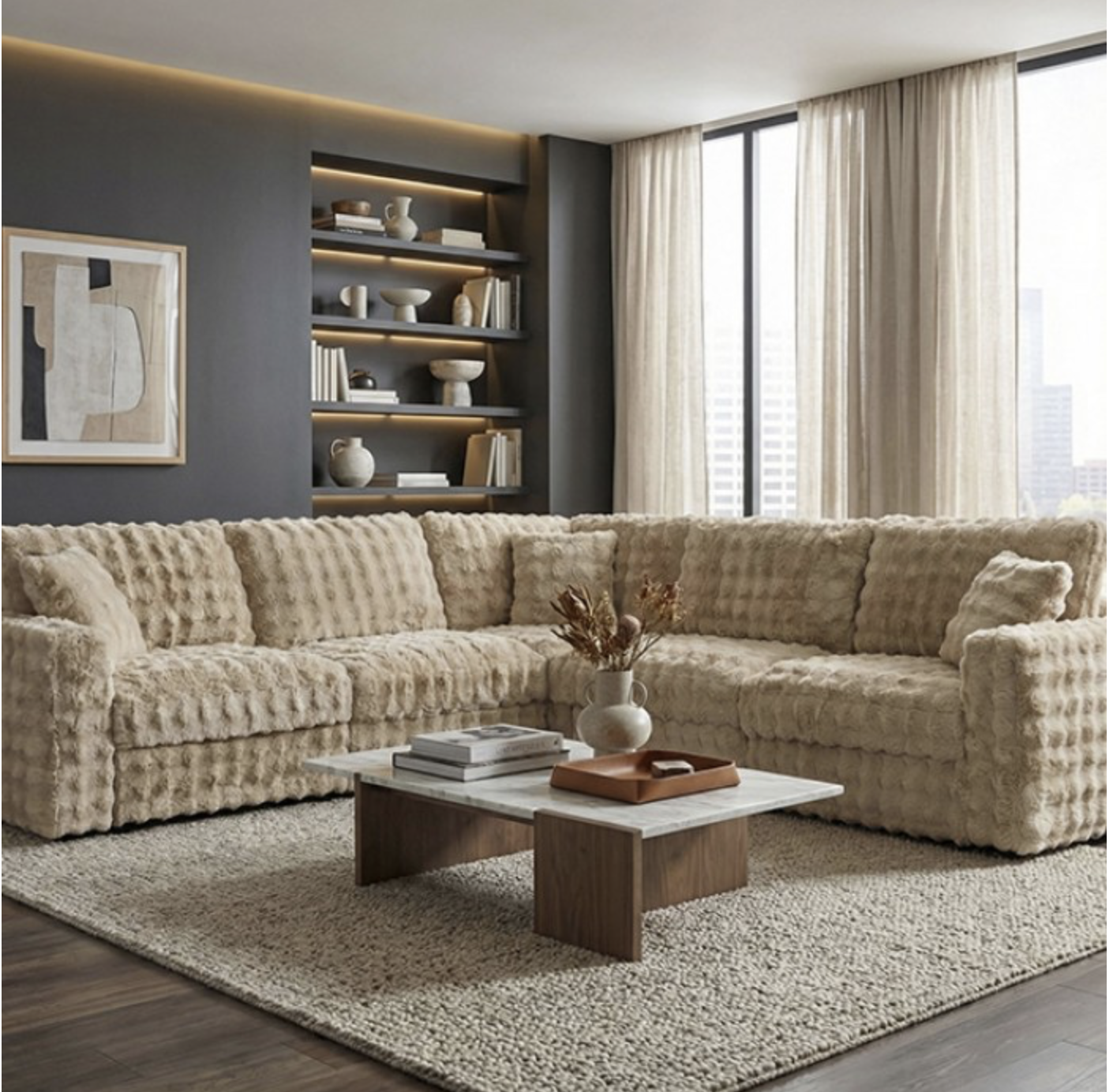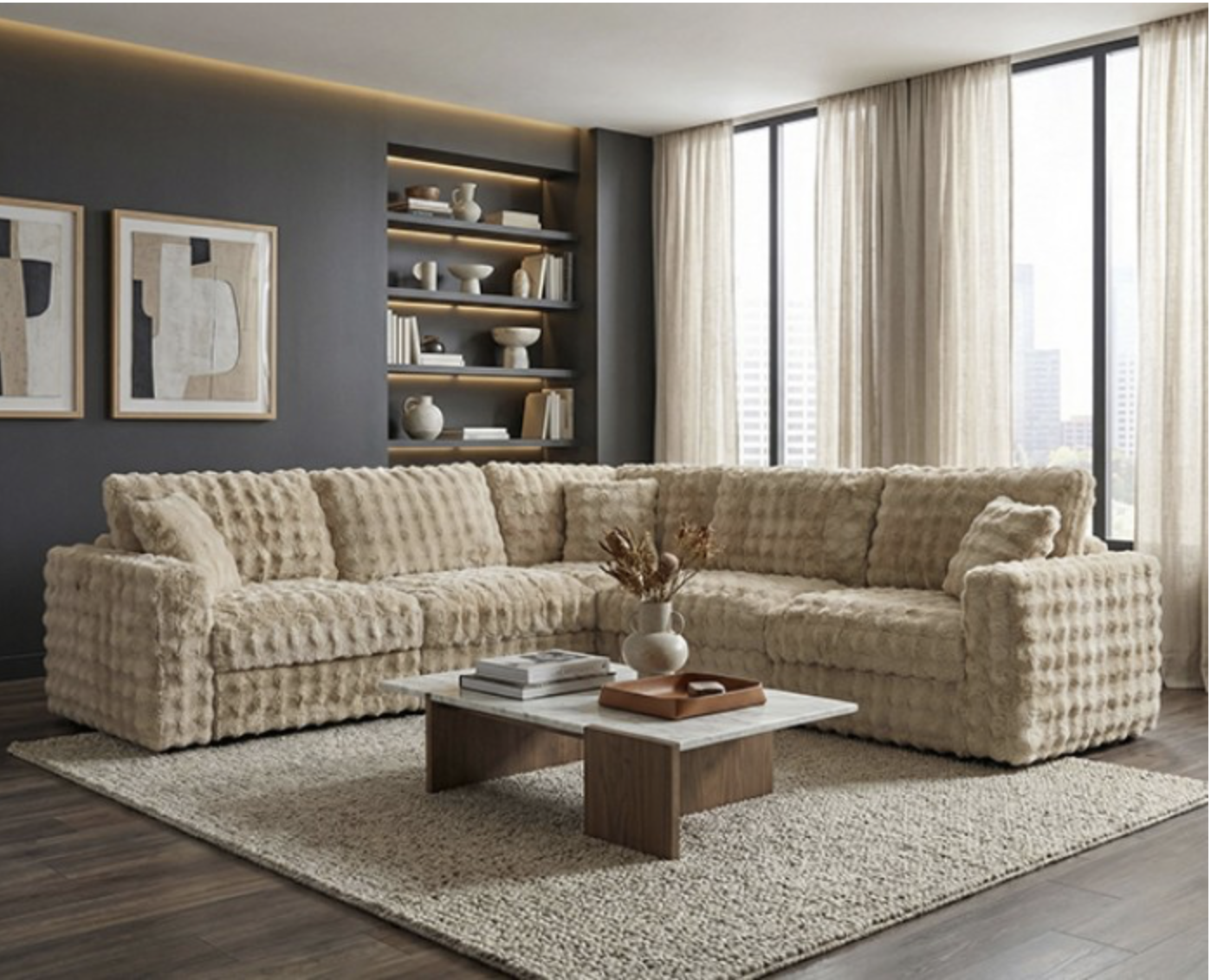 Create a cozy and inviting living space with this contemporary modular sectional. Upholstered in a soft sand-colored fabric, this piece brings warmth and versatility to any room. The spacious L-shaped design offers plenty of seating for family and guests, while the clean track arms and plush cushions provide both comfort and modern style. Perfect for lounging, entertaining, or everyday use, this sectional blends effortlessly with a variety of décor styles.
