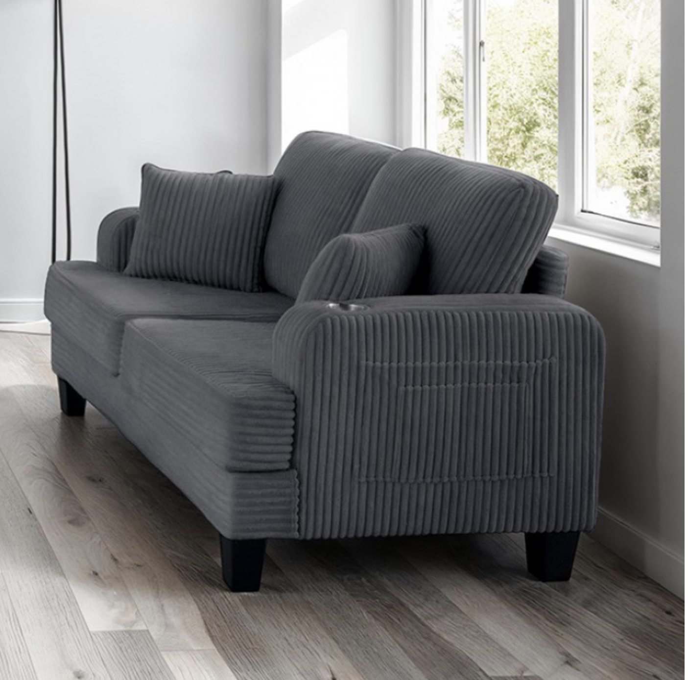 Upholstered in durable dark gray fabric and supported by an engineered wood frame, this piece delivers dependable structure and everyday comfort. Plush foam cushioning provides supportive seating, while the neutral tone allows for easy coordination with a wide range of décor styles. Its compact proportions make it ideal for apartments, smaller living spaces, or as part of a coordinated seating set.