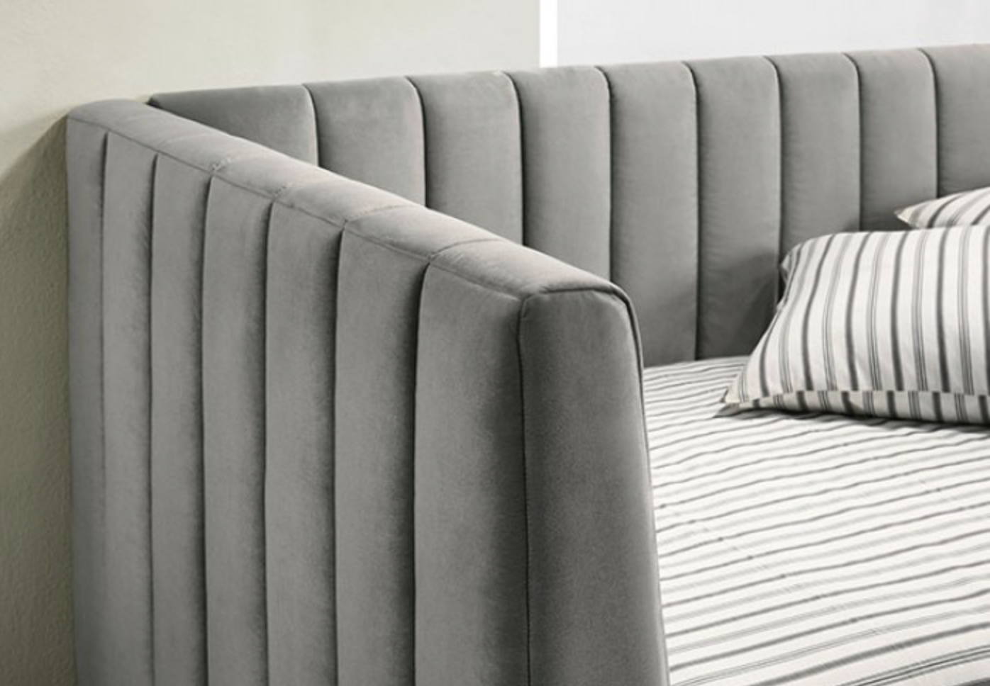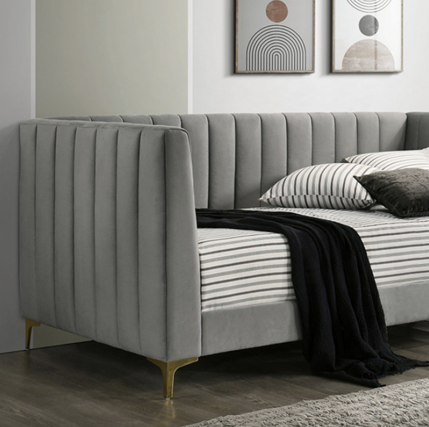 Upholstered in soft light gray flannelette fabric, the daybed provides a smooth and comfortable surface while maintaining a modern, sophisticated appearance. The vertically channeled side panels add texture and visual interest, enhancing its contemporary design. A sturdy metal frame ensures lasting durability and support, while the gold-finished base adds a touch of elegance and contrast to the light upholstery.